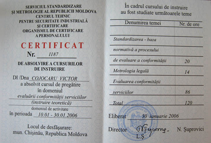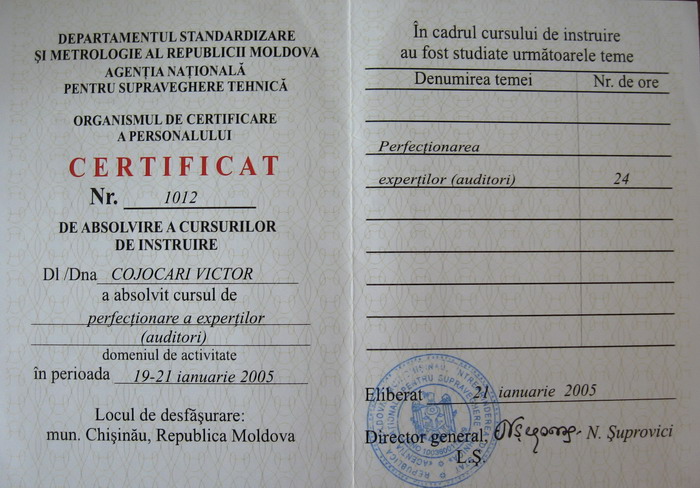 | 7. | Cursuri de perfectionare in domeniul certificarii serviciilor, Serviciul Standardizare si Metrologie, 2006, mun. Chisinau, cetrificat Nr. 1187 | ||||