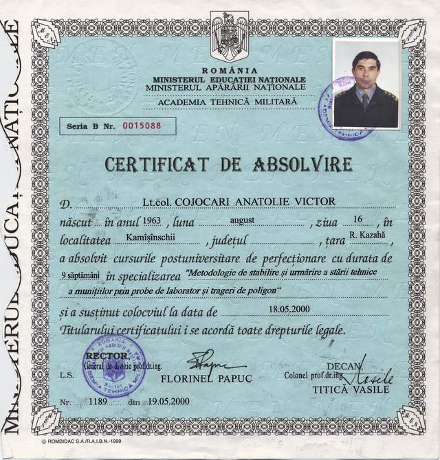 | 4. | Cursuri de perfectionare in domeniul “Metodologia de stabilire si urmarire a starii tehnice a munitiilor prin probe de laborator si trageri de poligon”, 1999-2000, Academia Tehnica Militara, Bucuresti, Poligonul de incercari Jegalia, Romania, Certificat seria B nr. 0015088. | ||||
