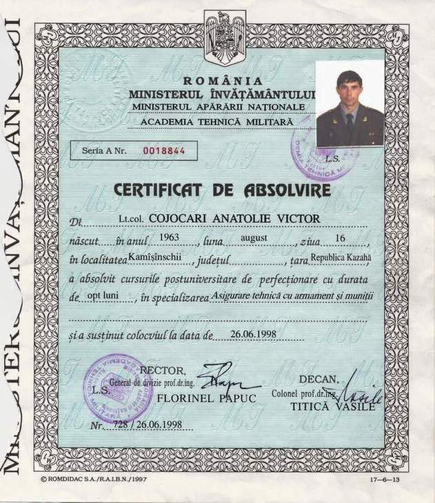 | 3. | Cursuri de perfectionare in domeniul “Asigurarea tehnica cu armament si munitii”, 1997-1998, Academia Tehnica Militara, Bucuresti, Romania, Certificat seria A nr. 0018844 | ||||