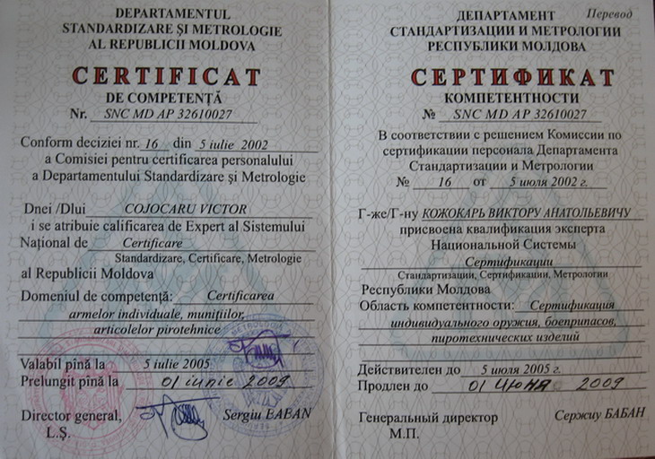 | 8. | 09. 2001-4.2007 specialist principal-expert al SNC MD, Centrul National pentru Omologarea Armelor si Munitiilor, Departamentul Standardizare si Metrologie | ||||