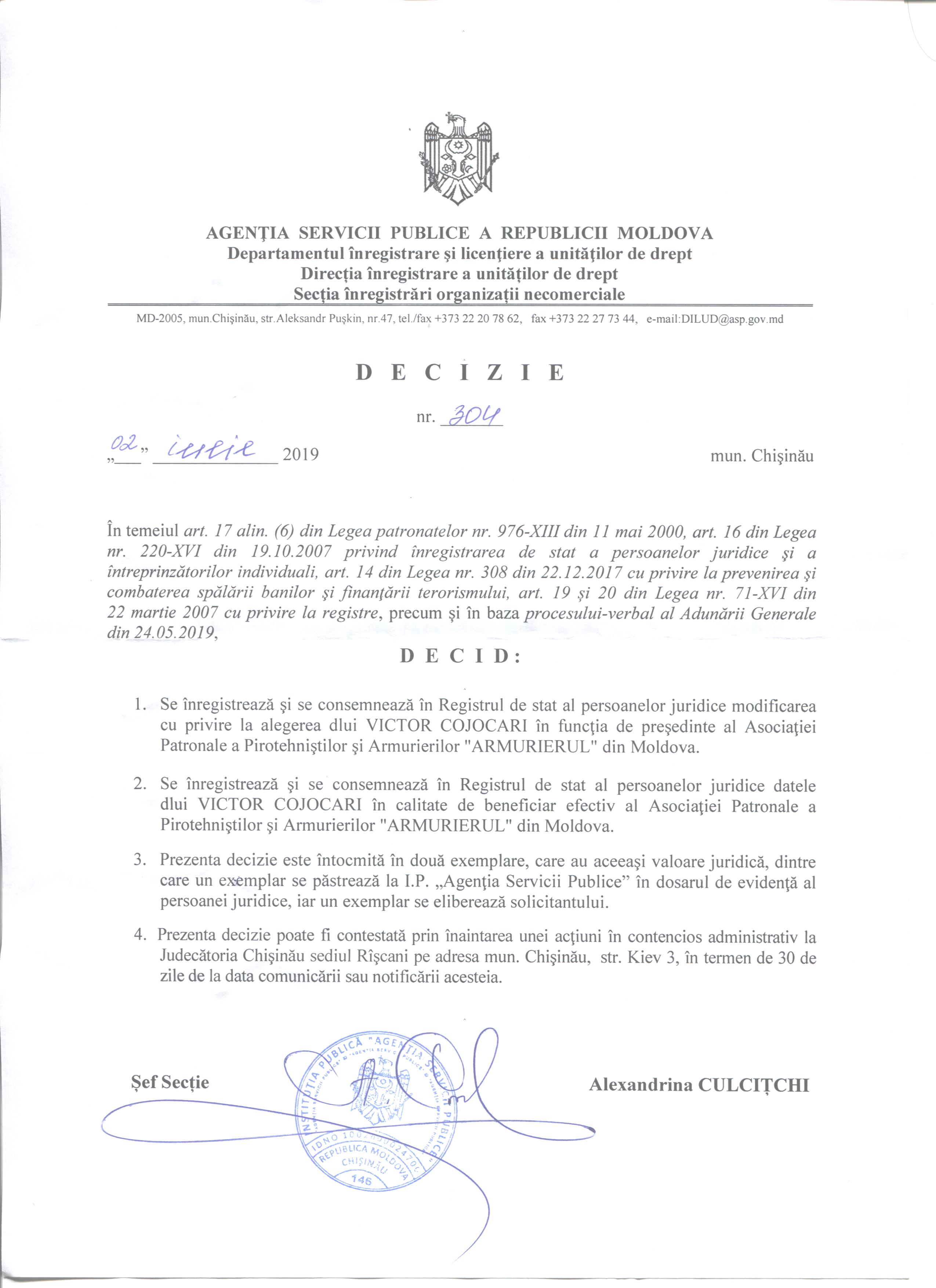 2007 - 2022 Presedinte al patronatului pirotehnistilor si armurierilor ”ARMURIERUL” din Moldova |