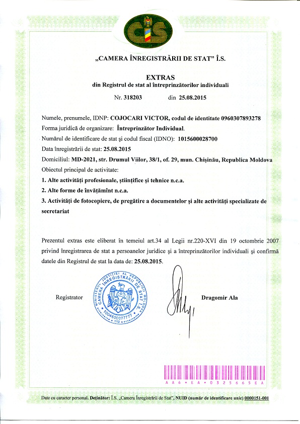 | 2. | din 25.08.2015 administrator al I.I. "Victor Cojocari" | ||||