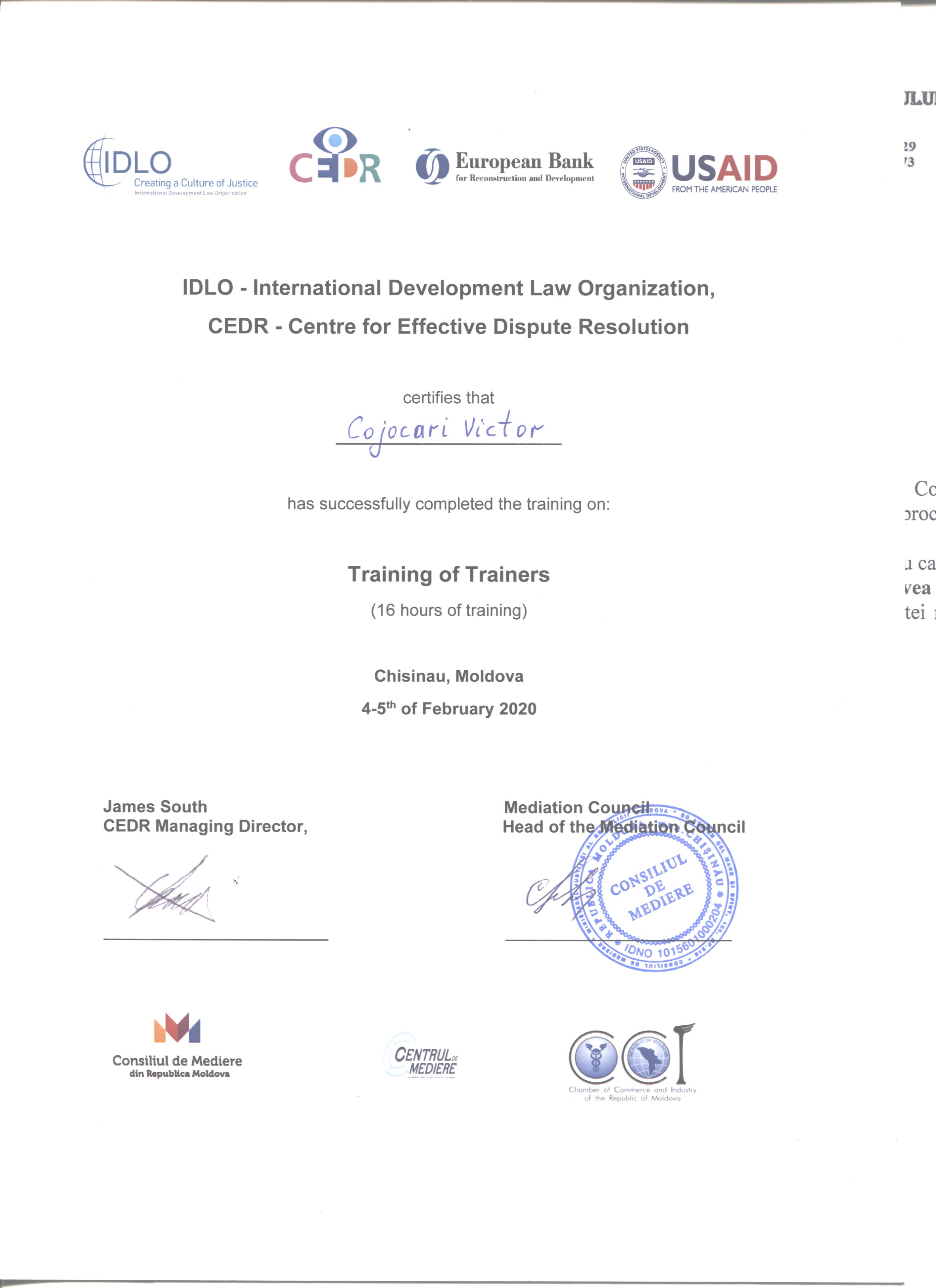 | 12 | Trainingului de „Formare a Formatorilor în Mediere”, 04-05.02.2020, Organizația Internațională pentru Dezvoltare Dreptului (IDLO) împreuna cu Banca Europeană pentru Reconstrucție și Dezvoltare (BERD) și finanțat de către USAID în parteneriat cu Consiliul de Mediere, Camera de Comerț și Industrie a Republicii Moldova și Centrul de Mediere | ![]() |