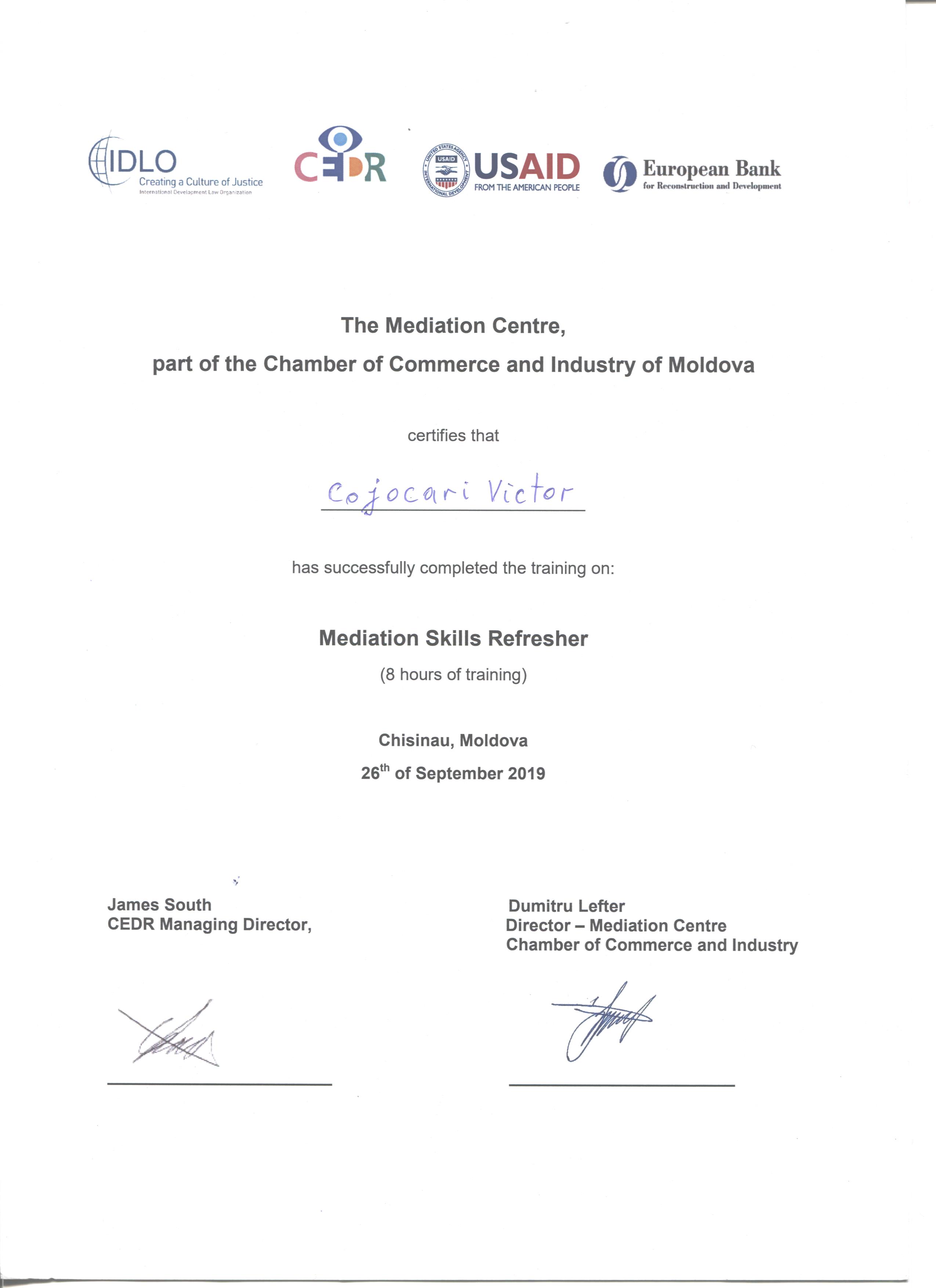 | 11 | Trainingului ”Perfectionarea abilitatilor de mediere”, organizat de CEDR si Centrul de Mediere al Camerii de Comerț și Industrie a Republicii Moldova, 26 septembrie 2019 | ![]() |